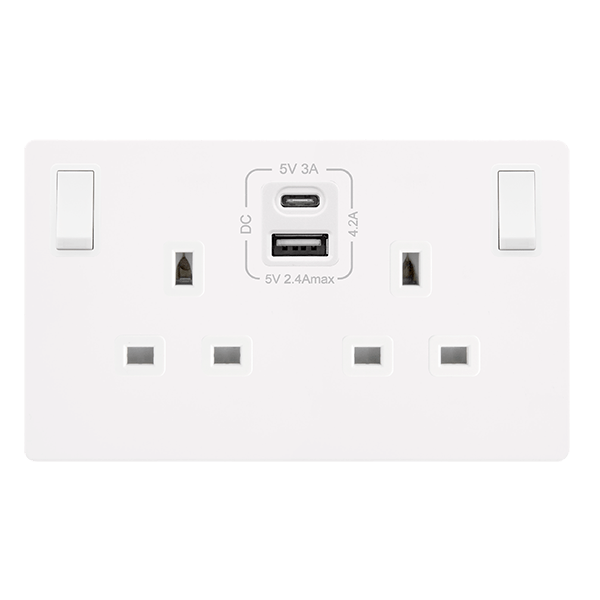 13A INGOT 2 GANG SWITCHED SAFETY SHUTTER SOCKET WITH TYPE A & C USB - METAL WHITE COVER PLATE - POLAR WHITE INSERT